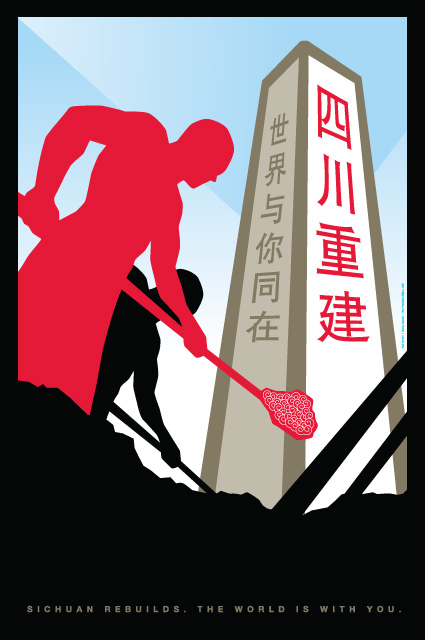I was traveling in China with a group of designers from the AIGA Center for Cross-Cultural Design when the devastating 8.0 earthquake struck in Sichuan Province. Looking for a way the creative community could harness our talents to help with the crisis, I was honored to be invited to participate in a benefit poster exhibition organized by the Sichuan Graphic Design Association. The final posters comprised a traveling exhibit, and they were also posted outdoors throughout communities affected by the disaster.