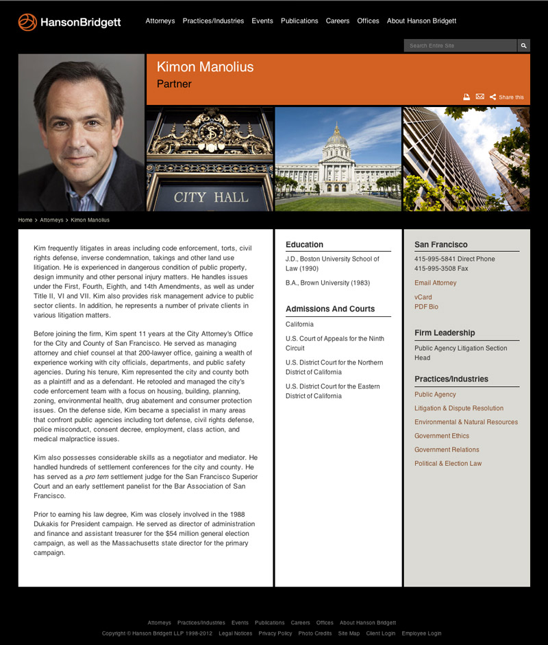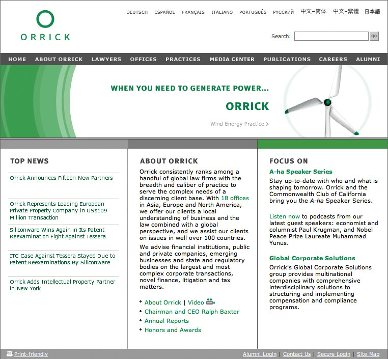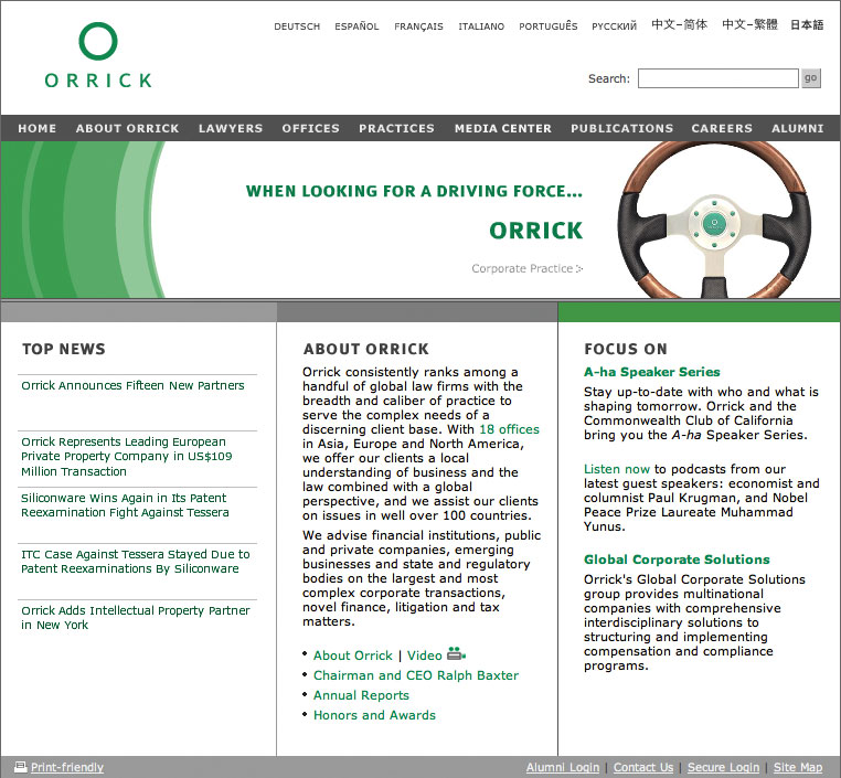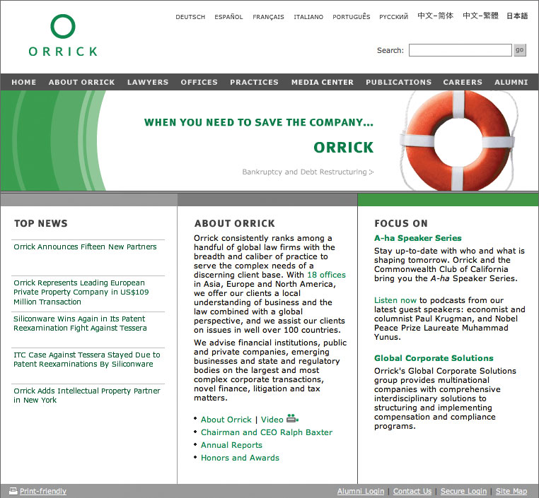 The visual design of the site was positioned to support Orrick's offline identity, while also establishing a distinct extension of the firm's brand for the online space. A marquee area on the homepage was used to create a new channel for Orrick's very successful print advertising campaign.