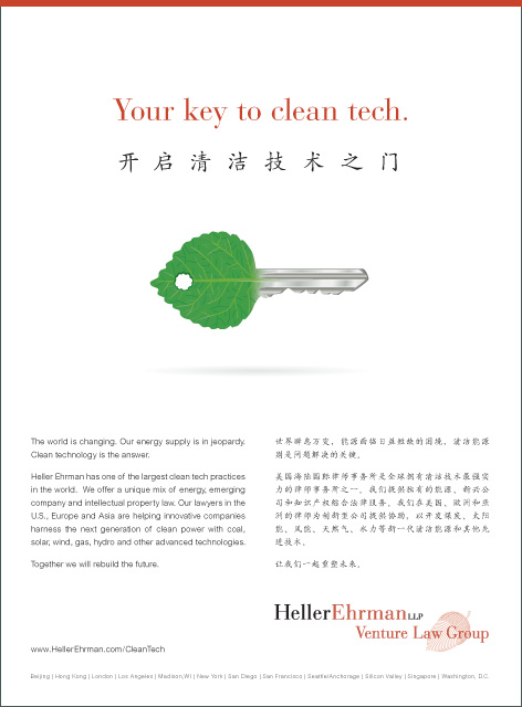 Creating a single piece that needs to play well across multiple languages and cultures is tricky business. This ad sought to promote Heller Ehrman's unrivaled experience working with clean technologies to audiences at a major conference in Beijing. The ad needed to resonate with Chinese companies looking to get into the clean tech space, as well as with American and European investors looking to enter the China market.