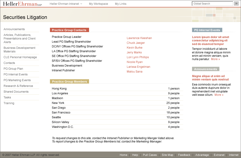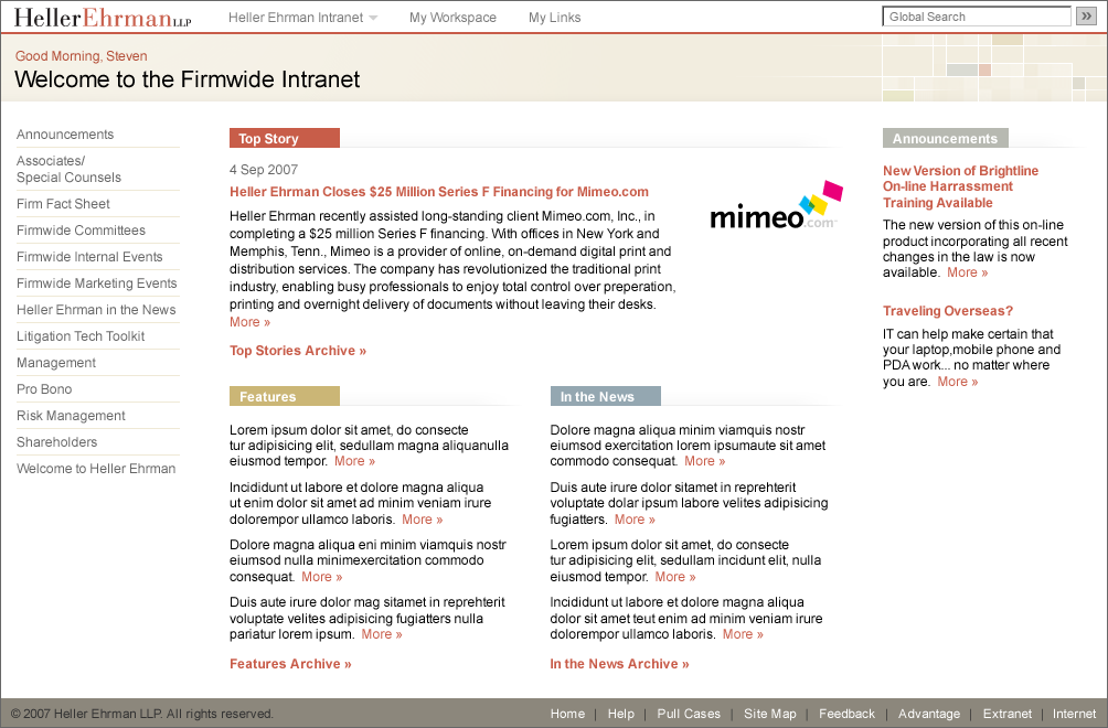 The firm’s intranet looked outdated, provided a poor user experience, and suffered from low acceptance. Complete redevelopment of the system was not a budget possibility, but our team used design skills to solve the problem with minimal cost or back-end implications. A visual facelift brought the site in line with the firm’s branding and gave the impression of a complete overhaul. A new, streamlined approach to navigation solved most of the user frustrations. And, by restructuring a few key pages, we created new channels for key internal communications. This project was a sterling example of what can happen when designers and developers blur the lines between disciplines.