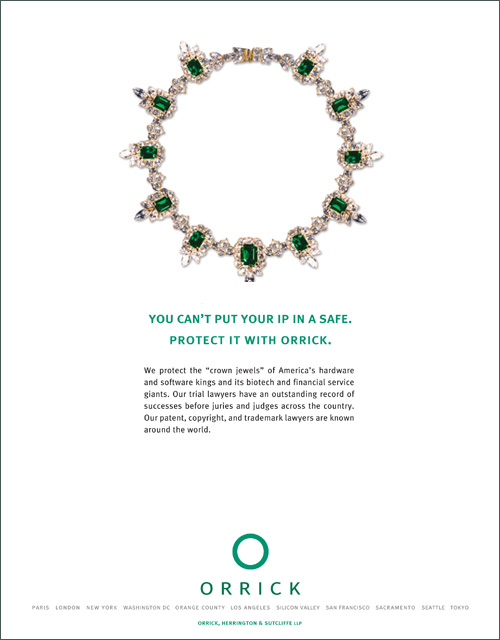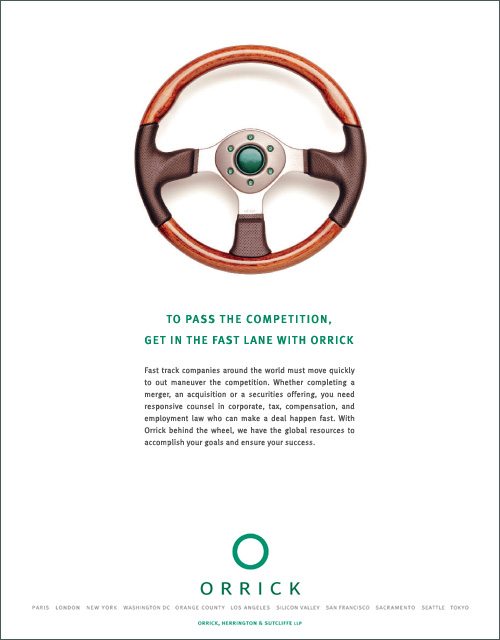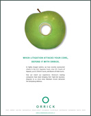 These advertisements were designed as part of Orrick's ongoing brand development campaign. Each ad uses an "O" image to portray a key issue faced by potential clients, while reinforcing the firm's identity. The ad copy uses a problem/solution format to highlight Orrick's capabilities in the appropriate area of practice.