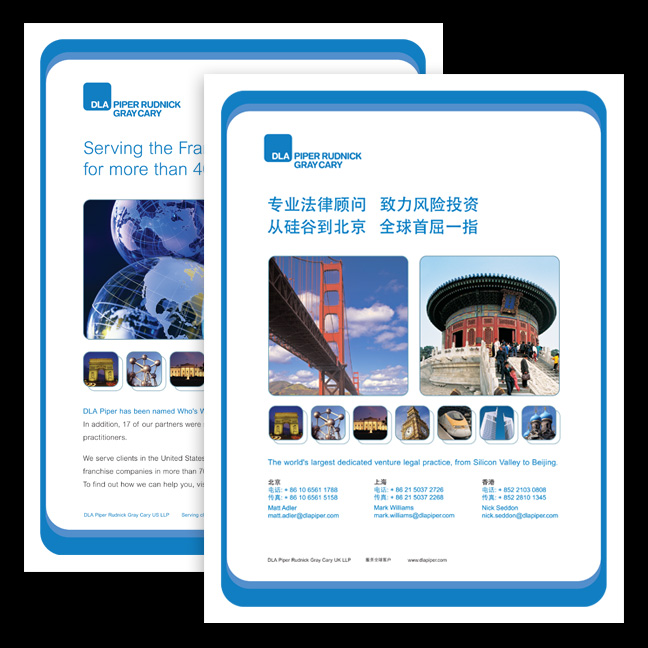 The DLA Piper brand spanned a tremendous gamut of subject areas, geographies and business situations. In order to respond quickly to opportunities, the firm's creative team needed a design system that could maintain a strong brand presence while also being nimble and flexible enough to accommodate unforeseen circumstances. We developed a visual language that employed limited graphic assets to solve these challenges through the consistent repetition of color, form and photographic style.